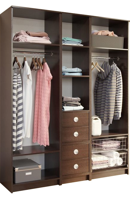 Вместительные стеллажи, выдвижные корзины, вешалки, брючницы и полки для обуви — вот составные элементы идеальной гардеробной. Система легка в монтаже и позволяет комбинировать модули, располагая их в нужном порядке.